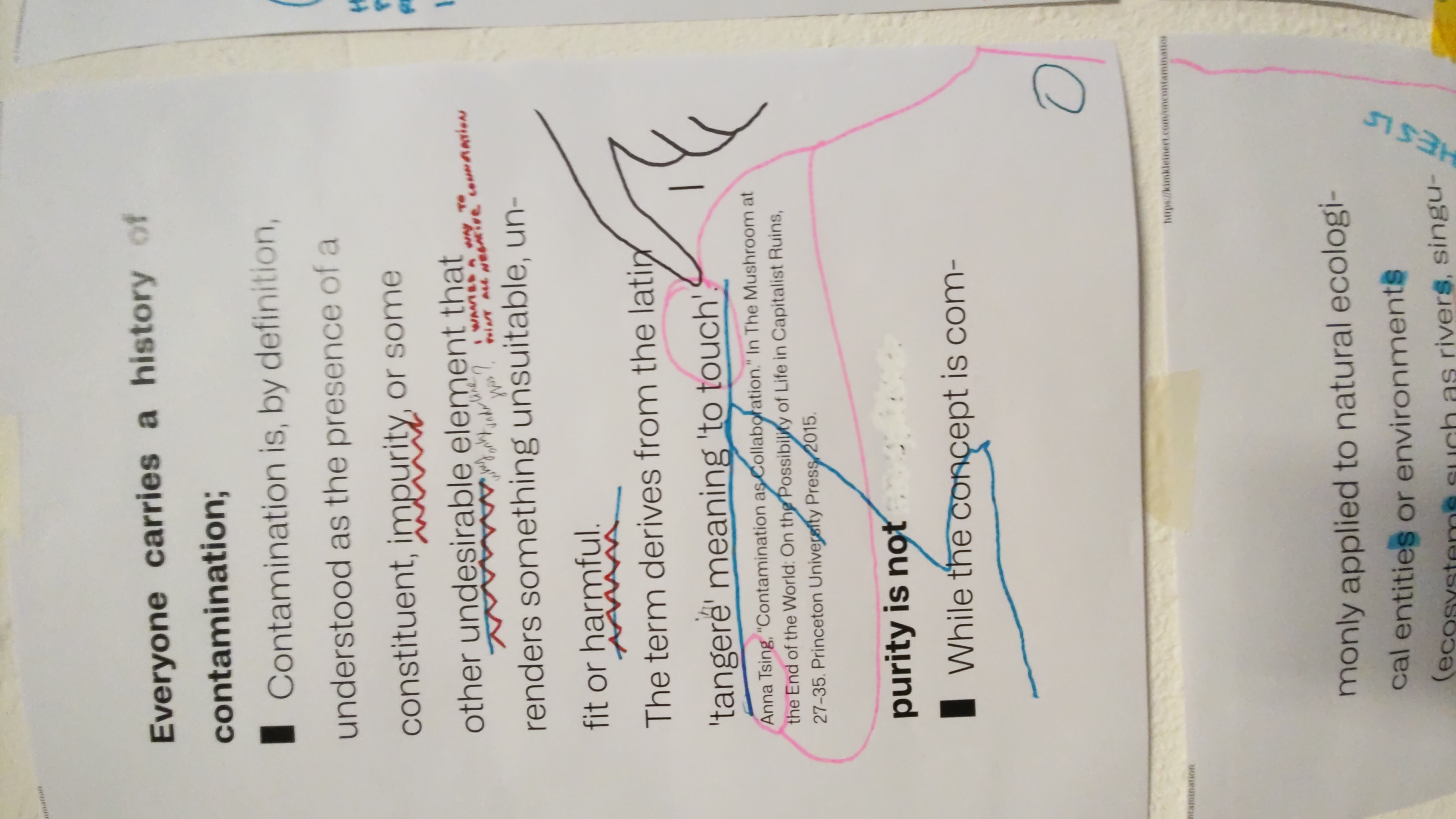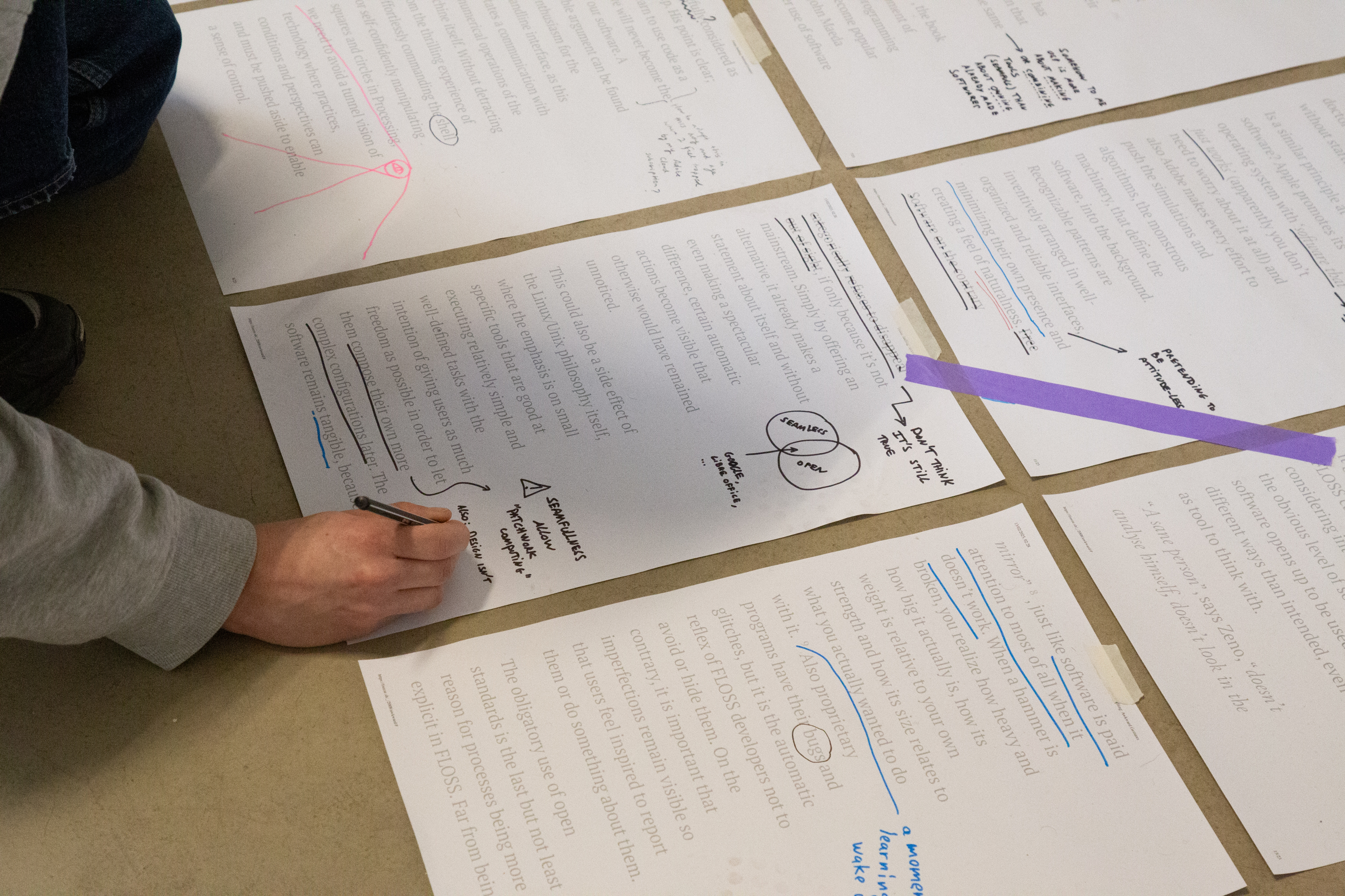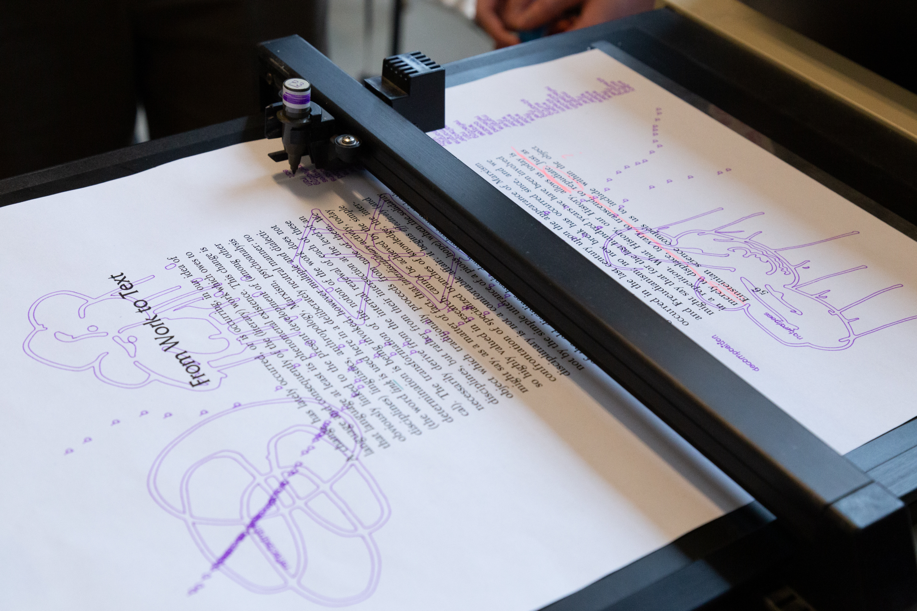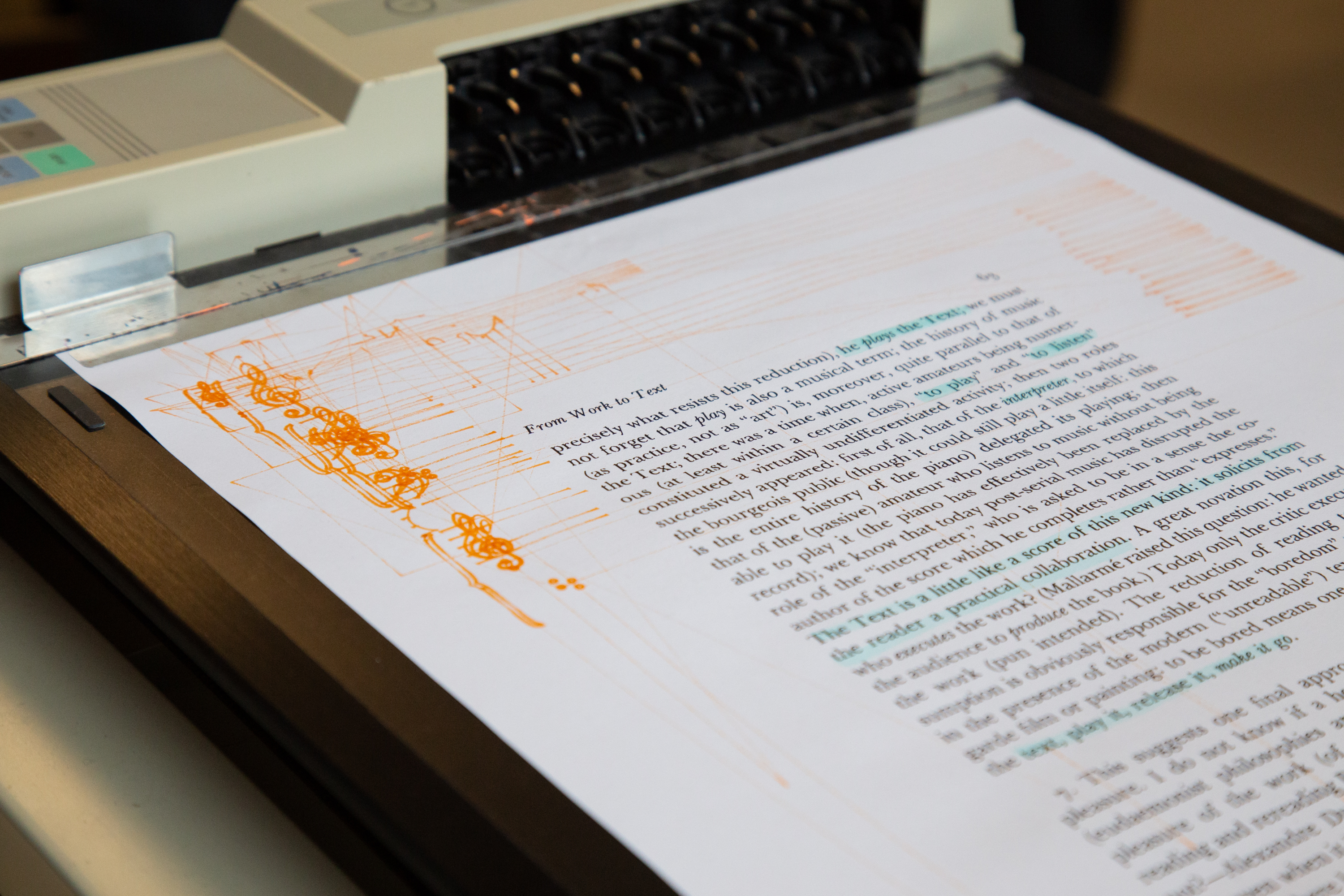 The tree text where printed on standard A4 and spatialized in the room. We bringed a pen-plotter, after a collective discussion and some reading, the participants where invited to detach the sheet and annotate them using computer graphics and pen-plotter technology, or by hands, producing echoing, spatialized and visual collective annotations. This was seen as much as a performative process, than a thinking process, and a plastic-visual process.