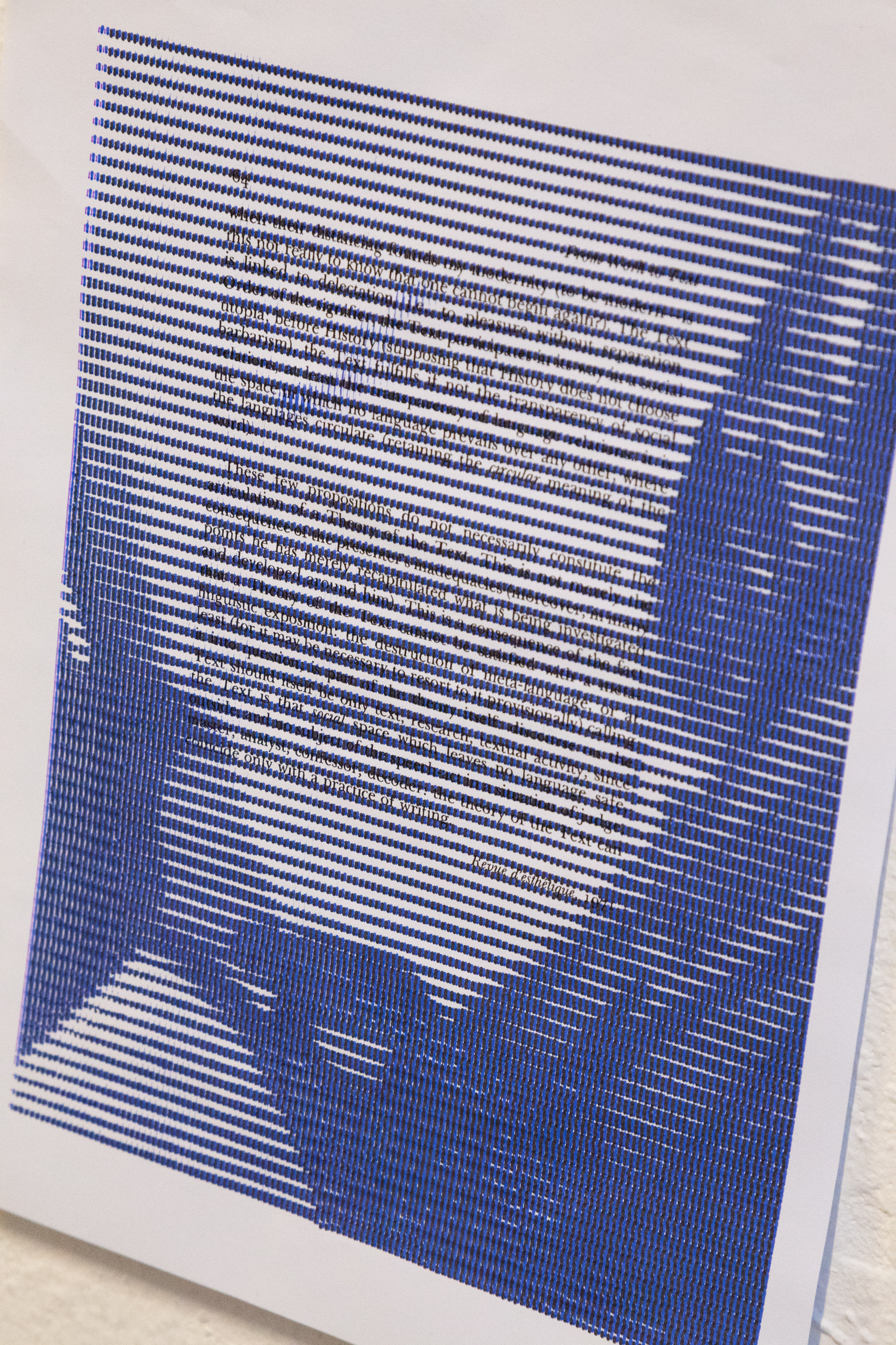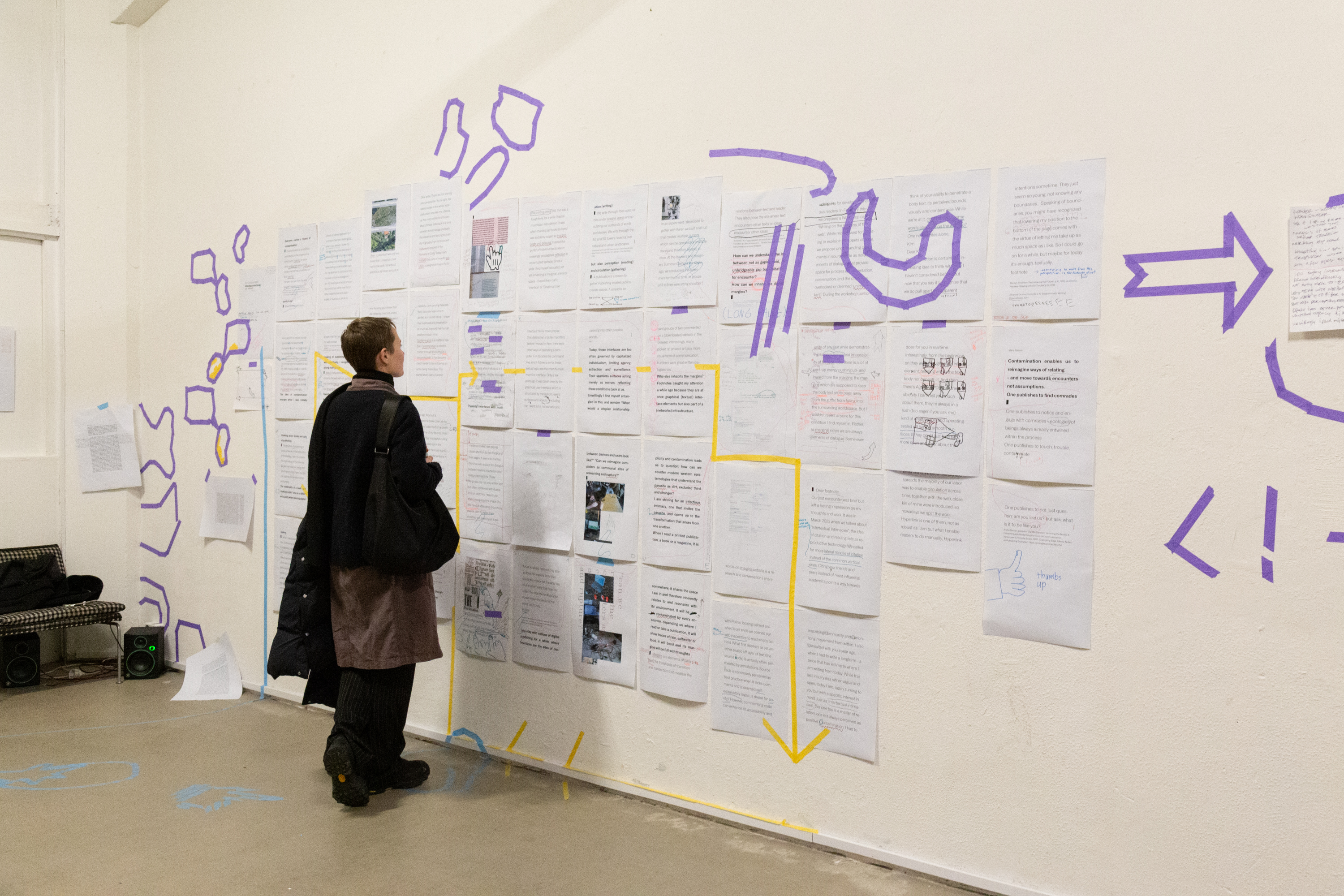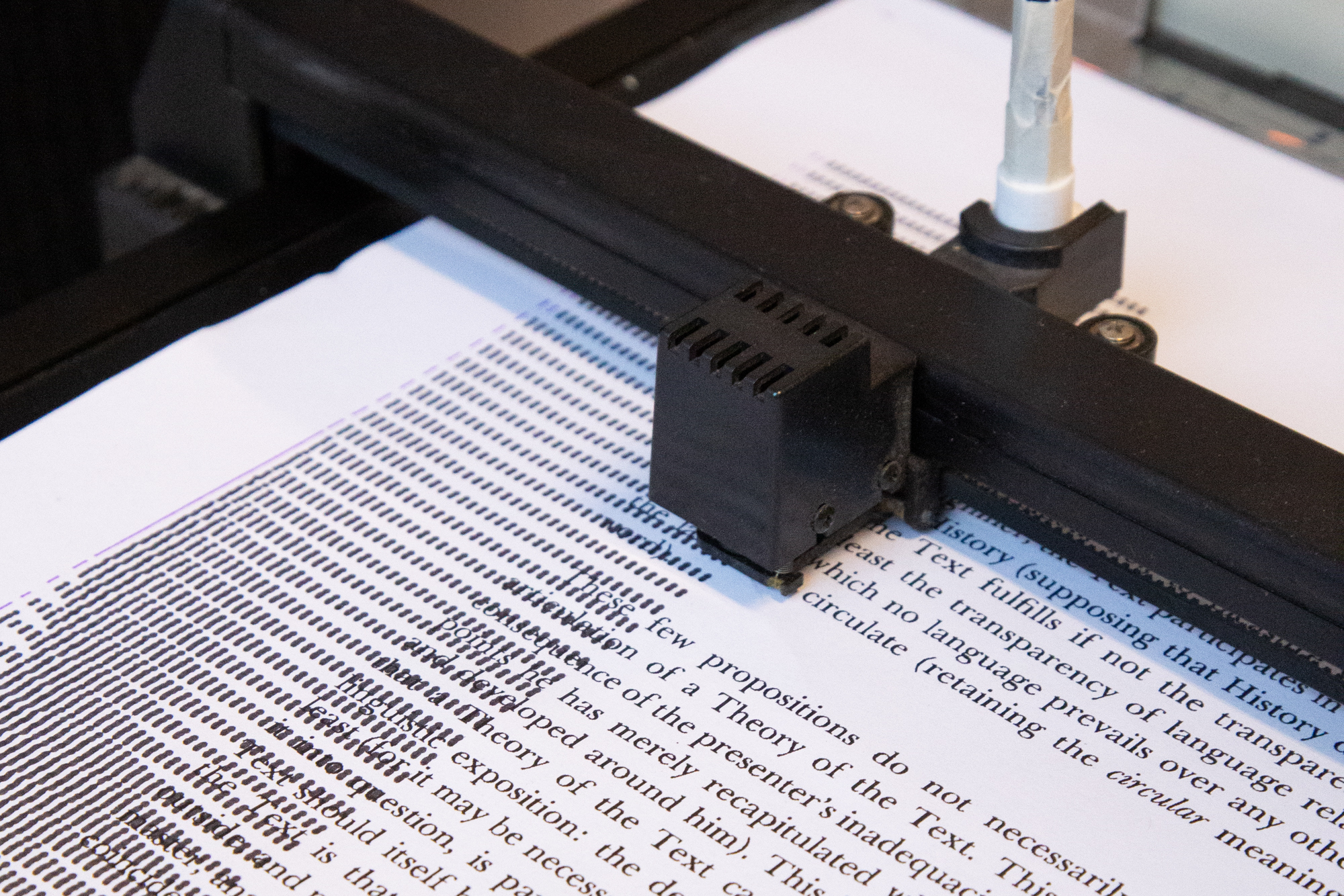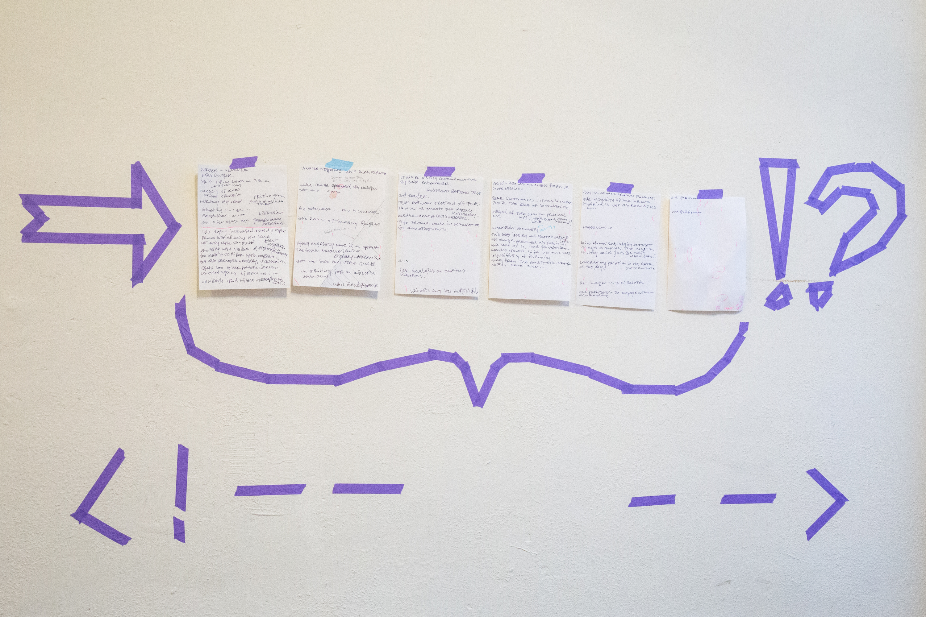 The tree text where printed on standard A4 and spatialized in the room. We bringed a pen-plotter, after a collective discussion and some reading, the participants where invited to detach the sheet and annotate them using computer graphics and pen-plotter technology, or by hands, producing echoing, spatialized and visual collective annotations. This was seen as much as a performative process, than a thinking process, and a plastic-visual process.