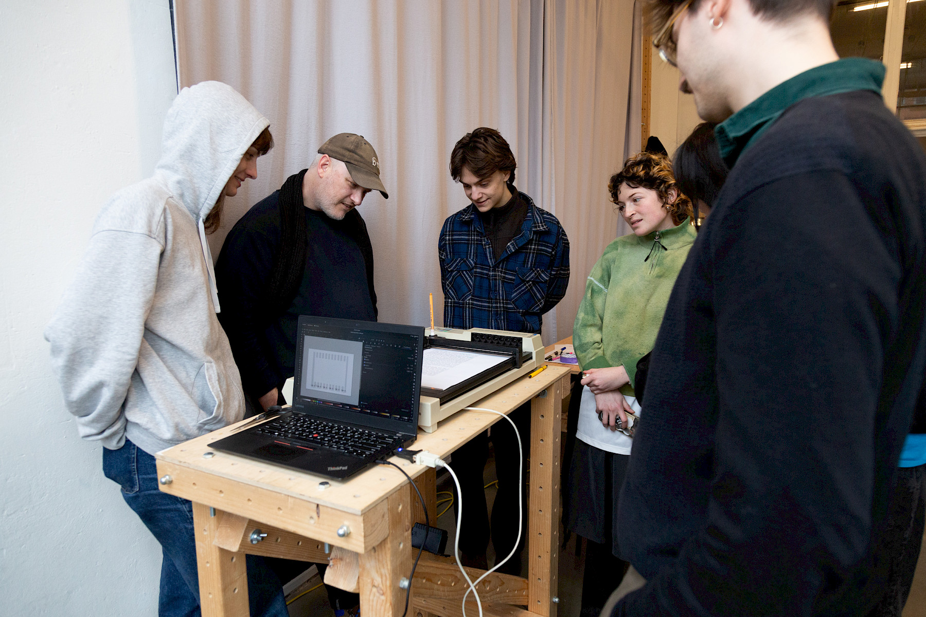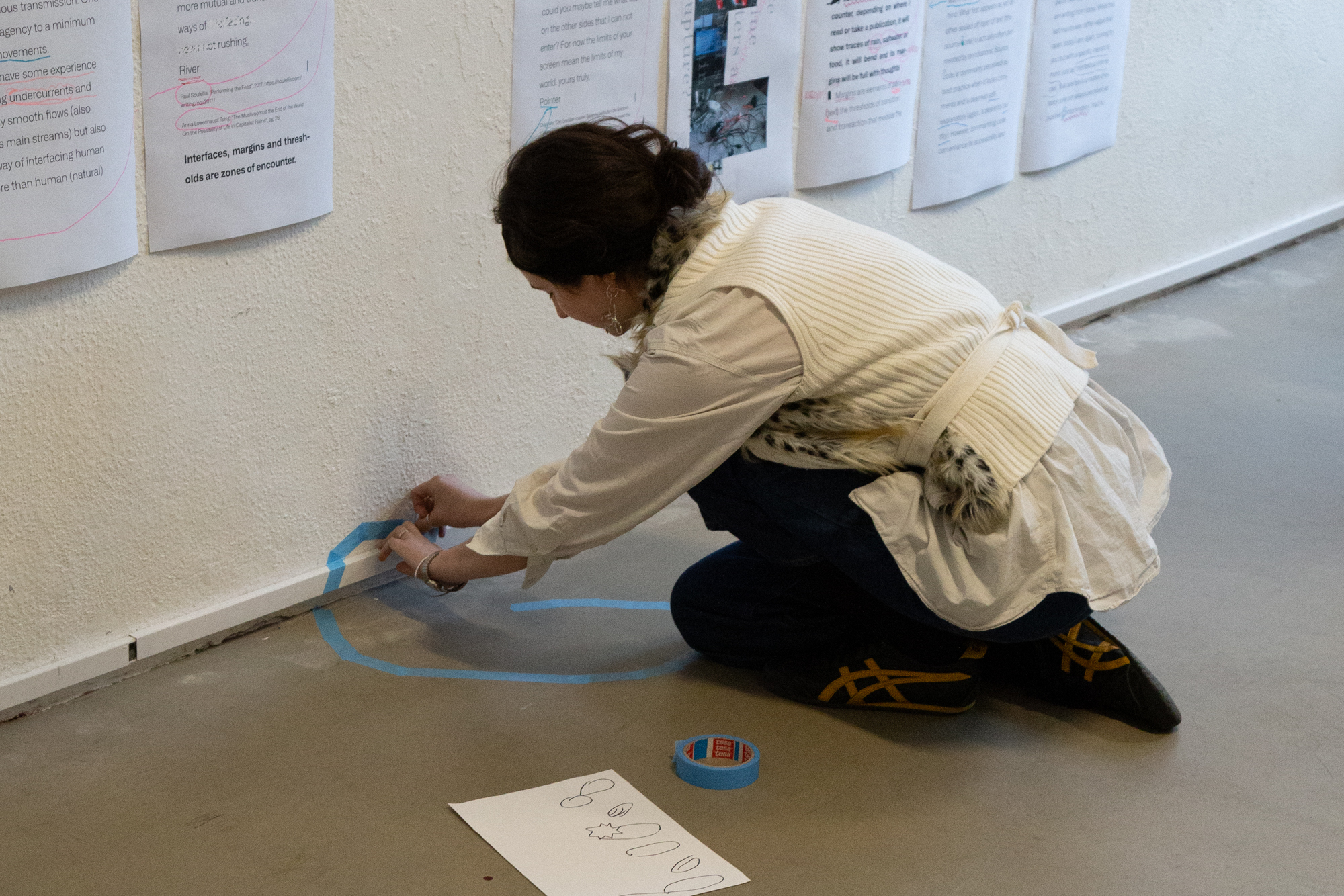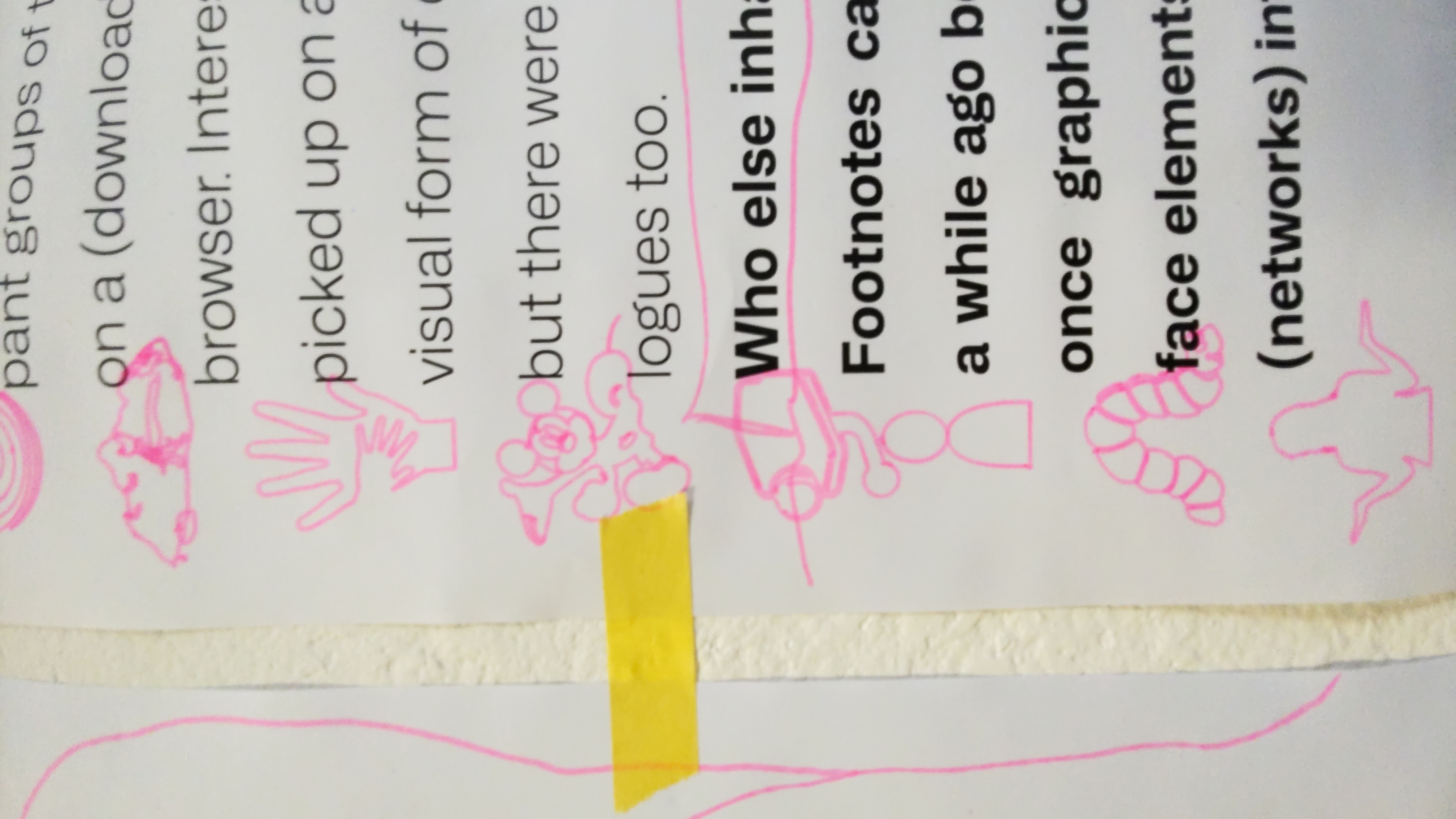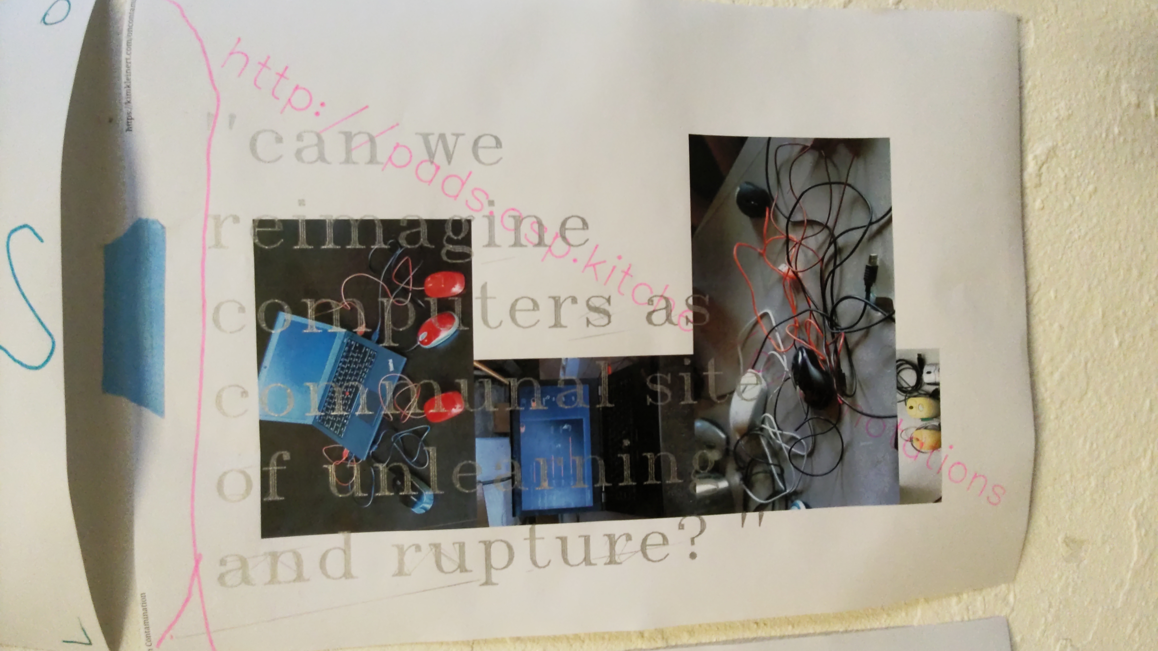 The tree text where printed on standard A4 and spatialized in the room. We bringed a pen-plotter, after a collective discussion and some reading, the participants where invited to detach the sheet and annotate them using computer graphics and pen-plotter technology, or by hands, producing echoing, spatialized and visual collective annotations. This was seen as much as a performative process, than a thinking process, and a plastic-visual process.