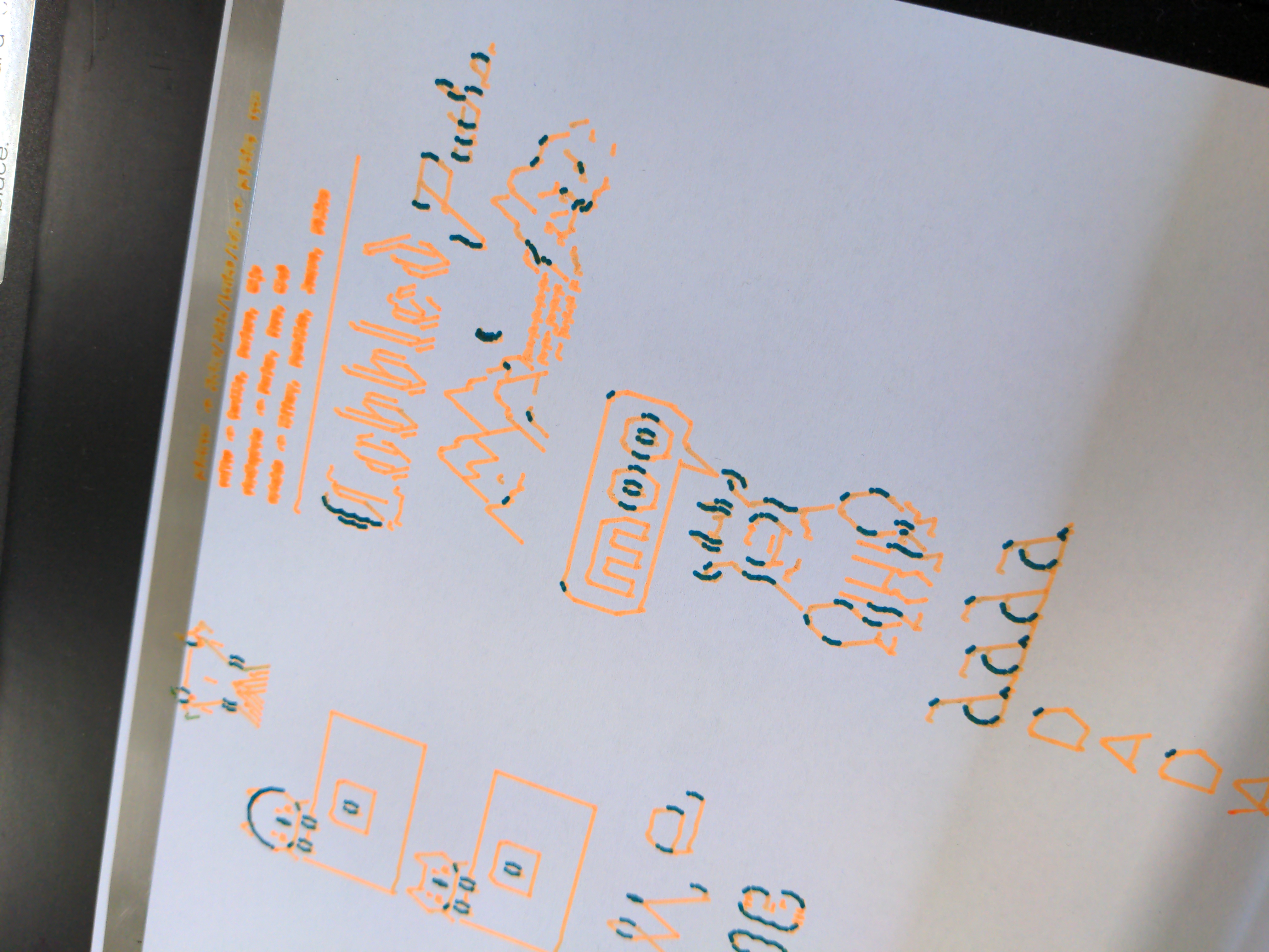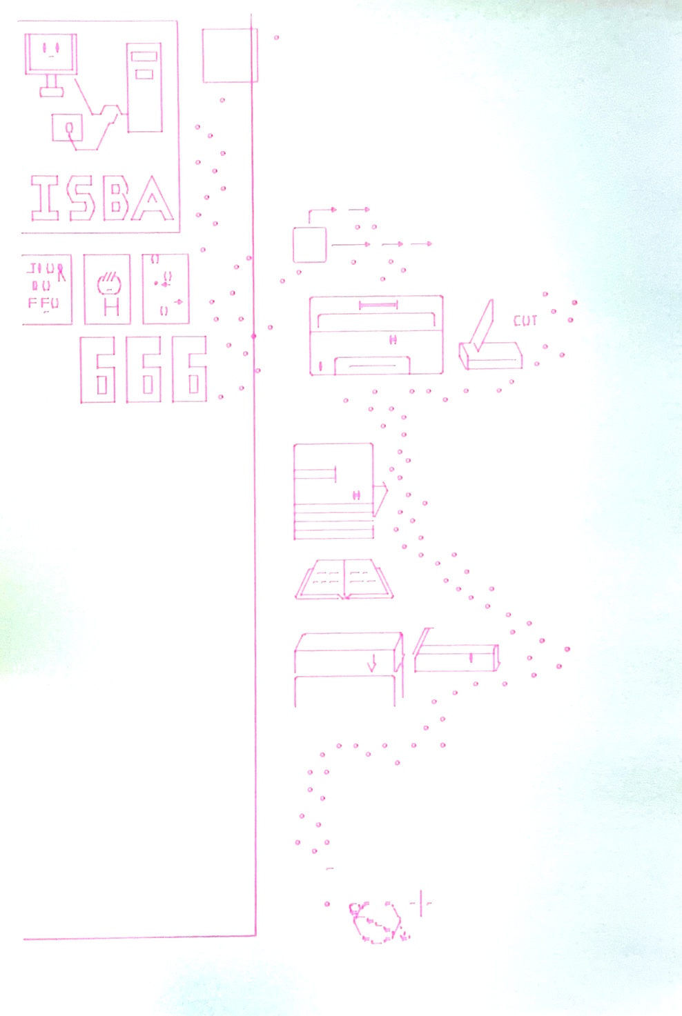 - Collective font: each draws a letter? Protocol: Agree on grid and style (choose one of the archetypes of the catalogue?). (60min, 45min drawing, 15min showing)