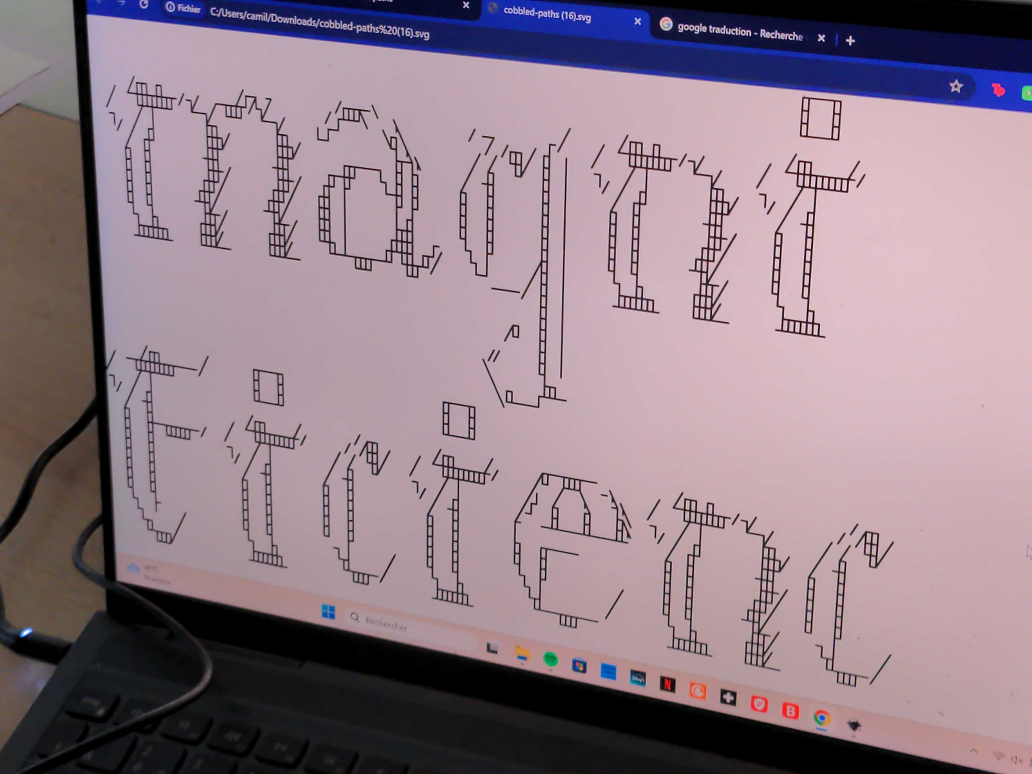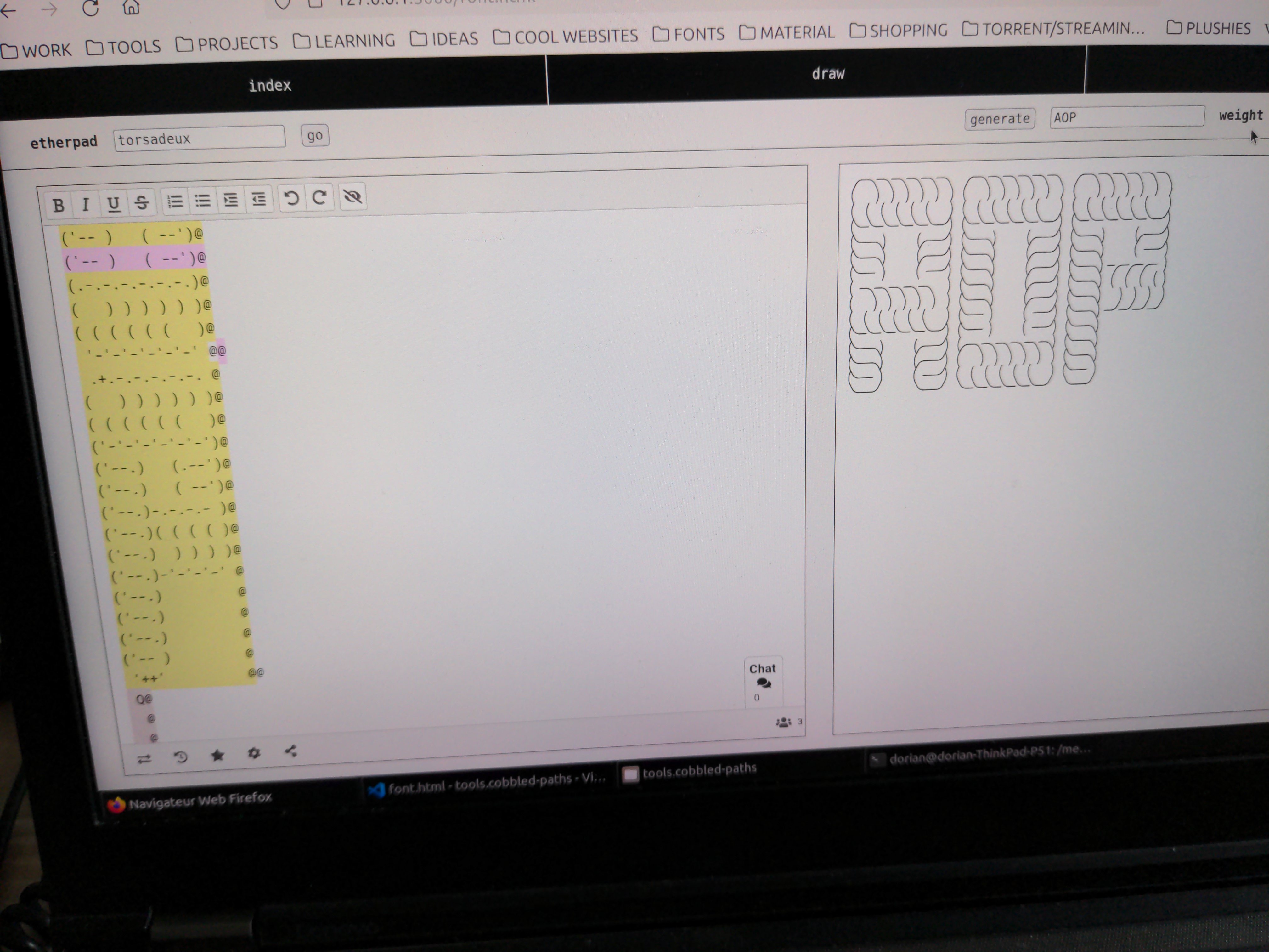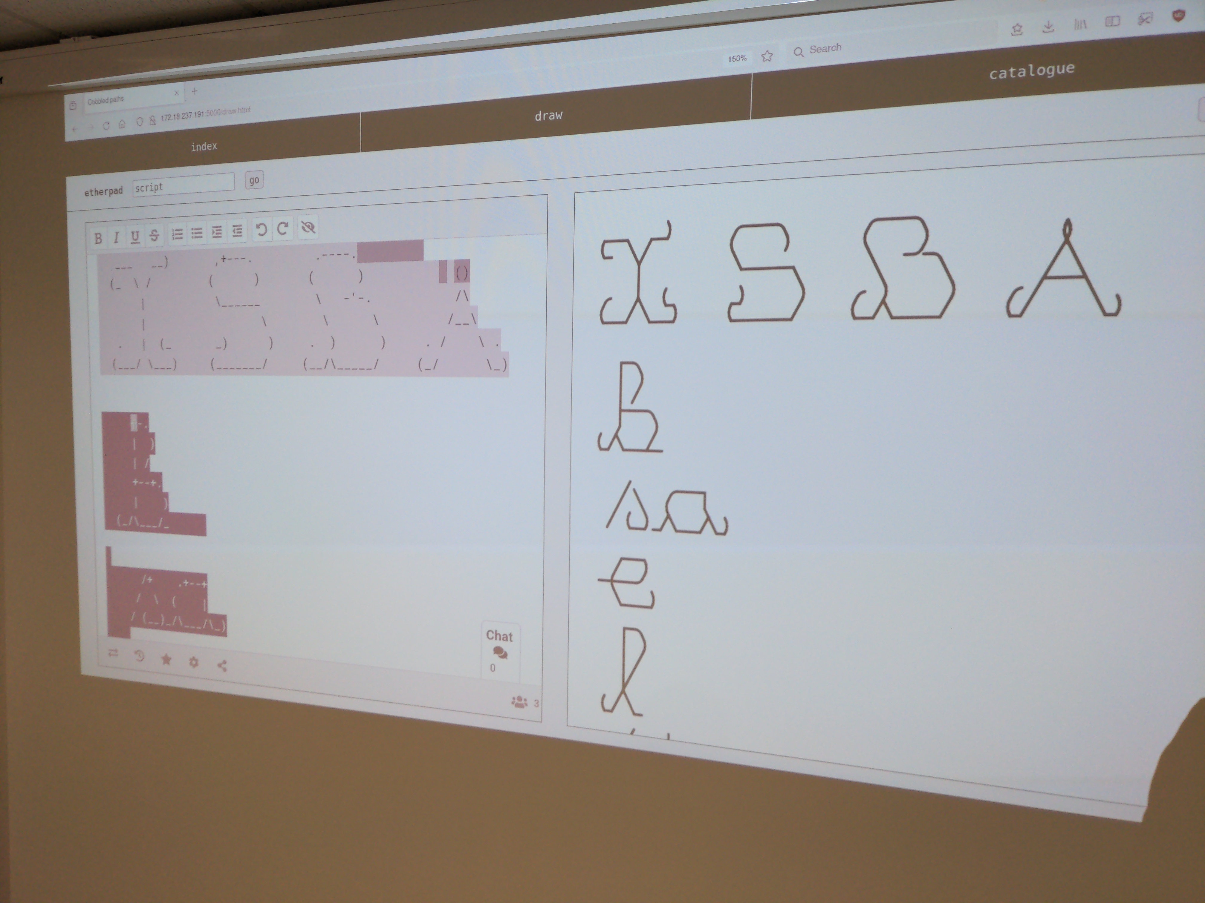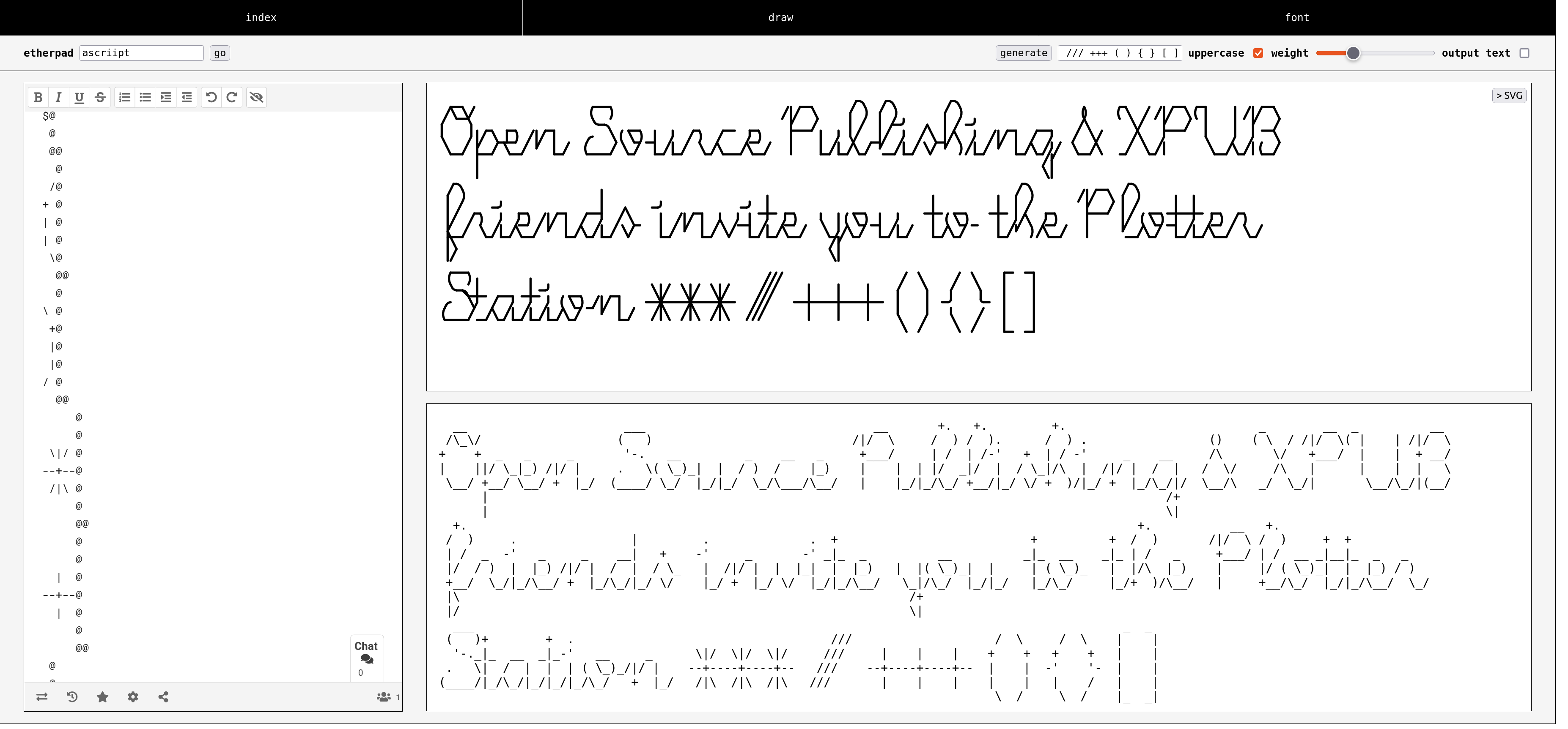 In our daily practice we explore the influence of tools on our work, and experiment with different tool-constellations for making design. During this workshop we want to draw and design fonts collectively, we propose a text-based recipe based on etherpad, figlet and svg bob. With figlet we will generate ascii art lettering, in etherpad, a collective writing, we will write together and SVG bob transforms the cobbles to smooth vectors, which will be drawn by a pen-plotter.