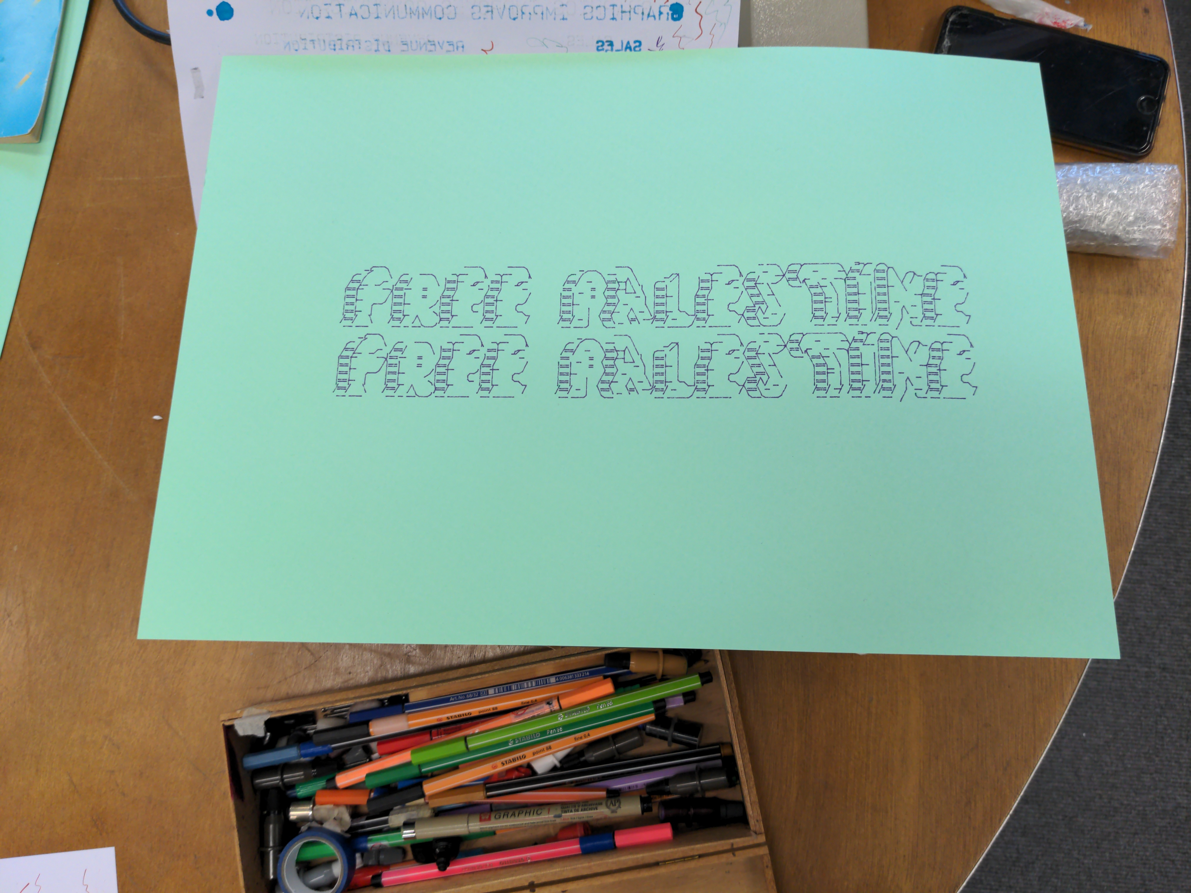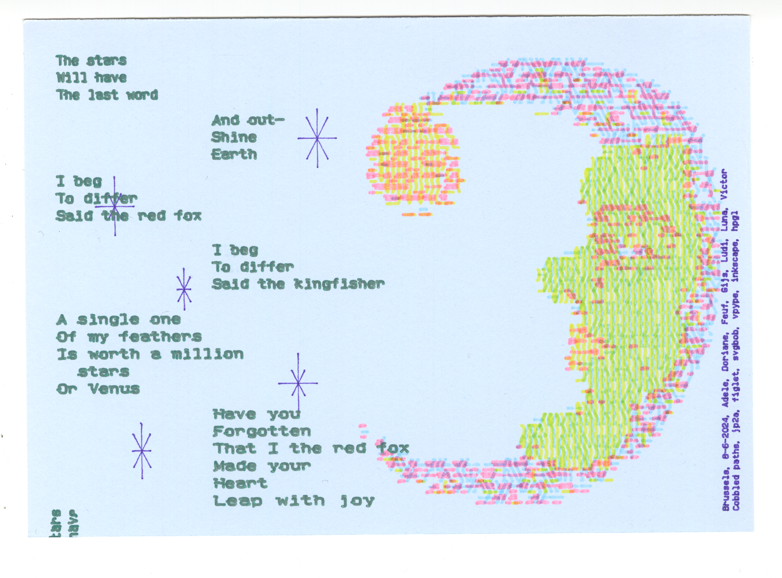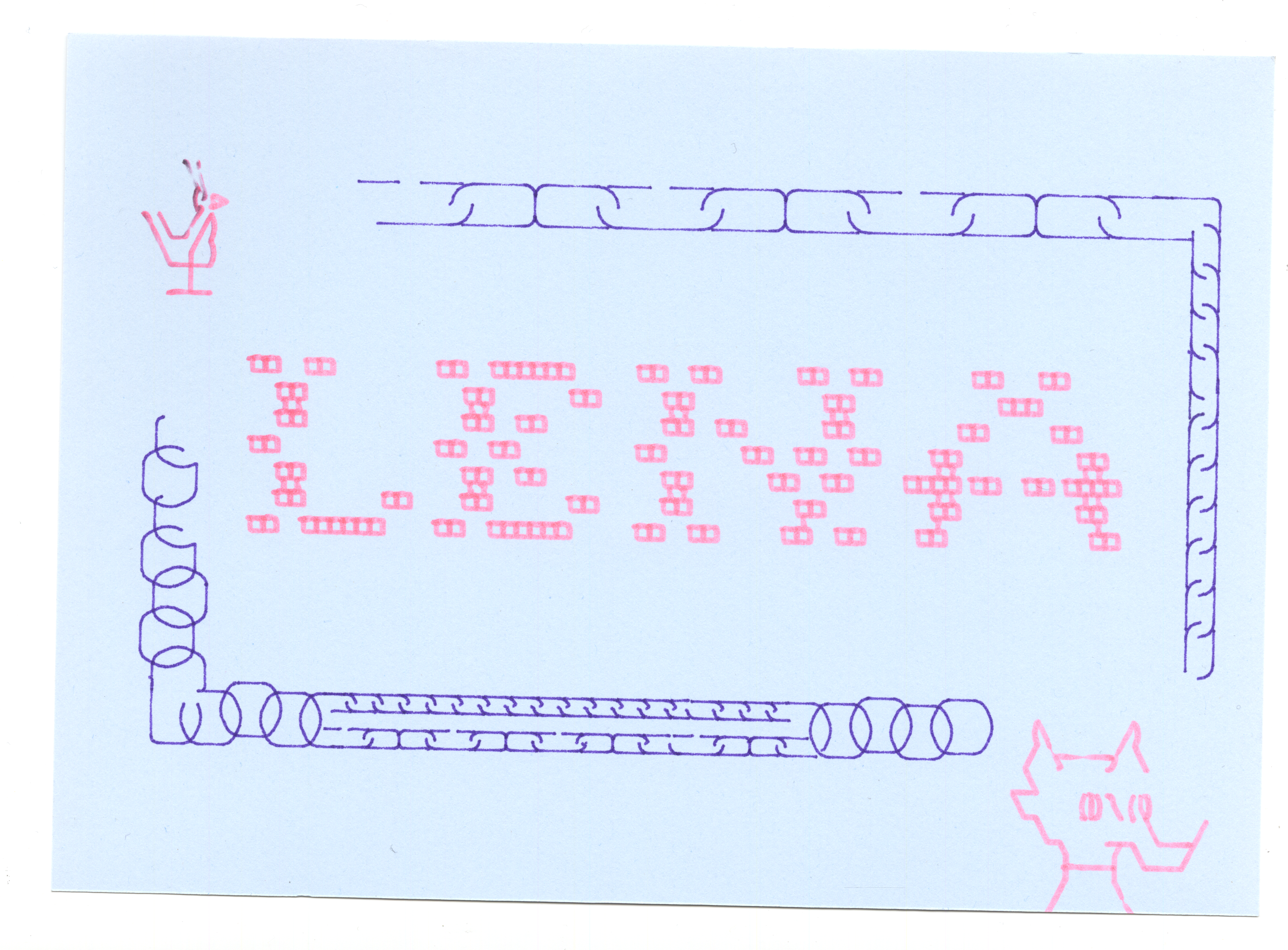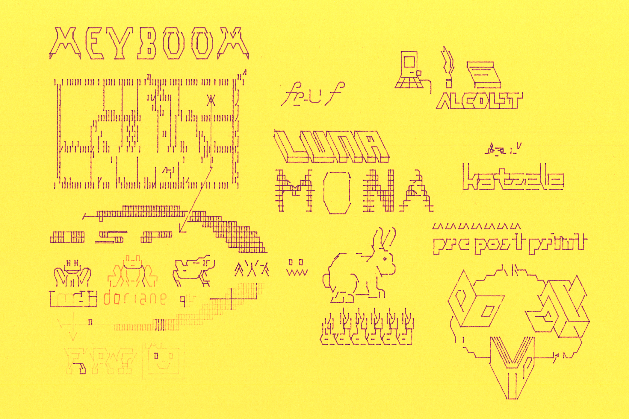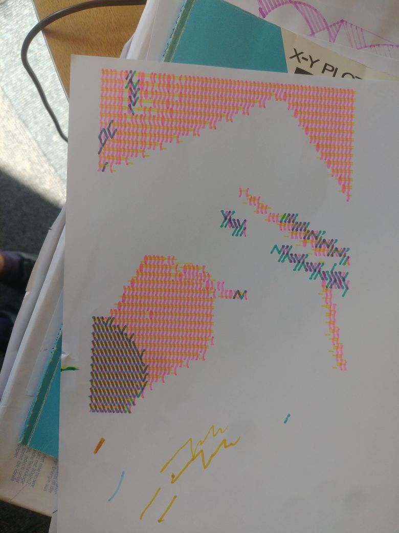 In the morning we will introduce our Ascii 2 Vector 2 Plotter pipeline. By making a first collaborative poster we'll explore the materiality of Ascii art, its grid and translation to SVG. This is a playground: copy and paste found Ascii art, start drawing letters, explore patterns and diagrams and remix each others drawings.