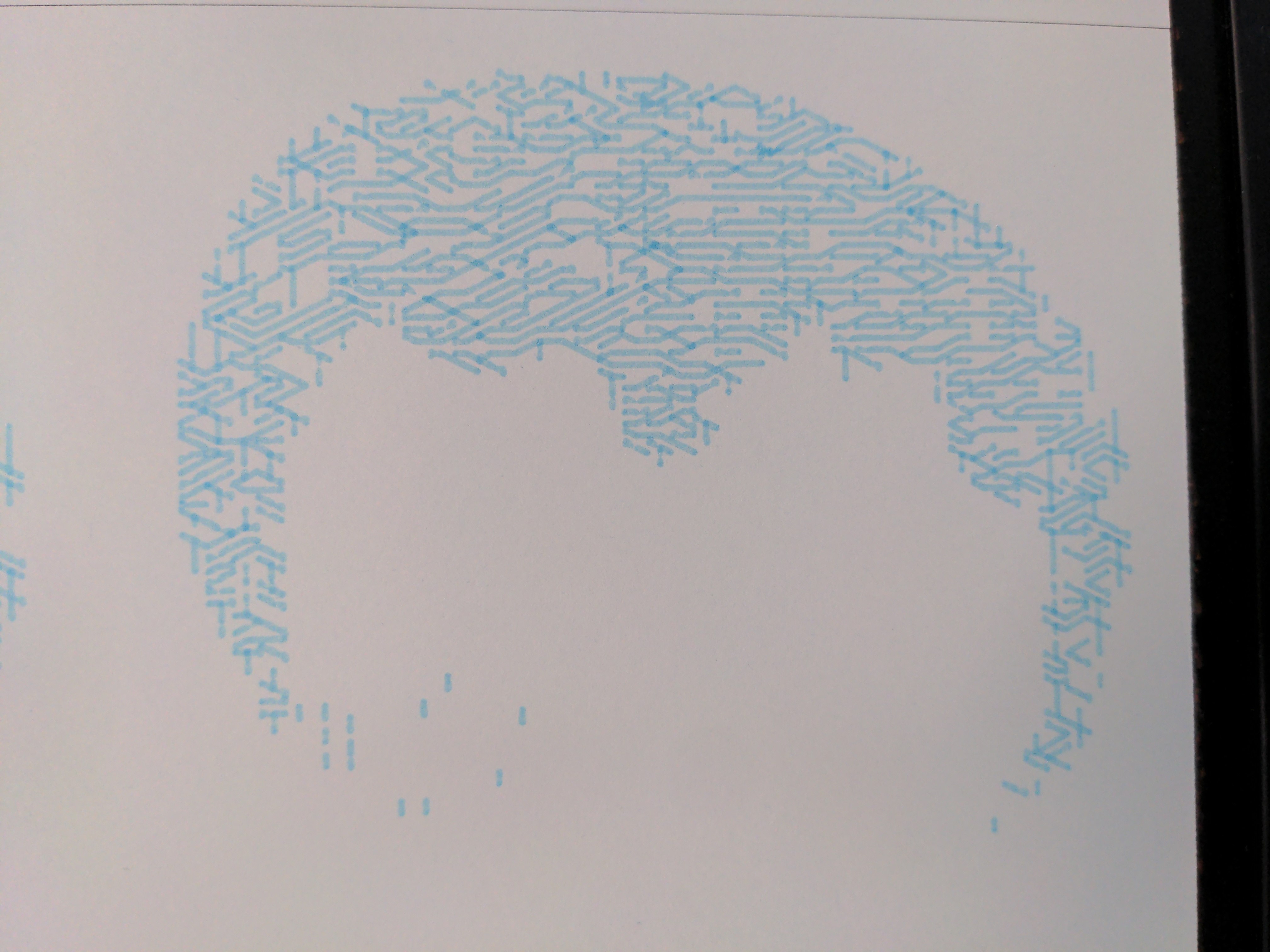 First experiments. There was a desire and temptative to decompose an image with an JPG2ASCII tool using different characters to create colored halftone with different pens.